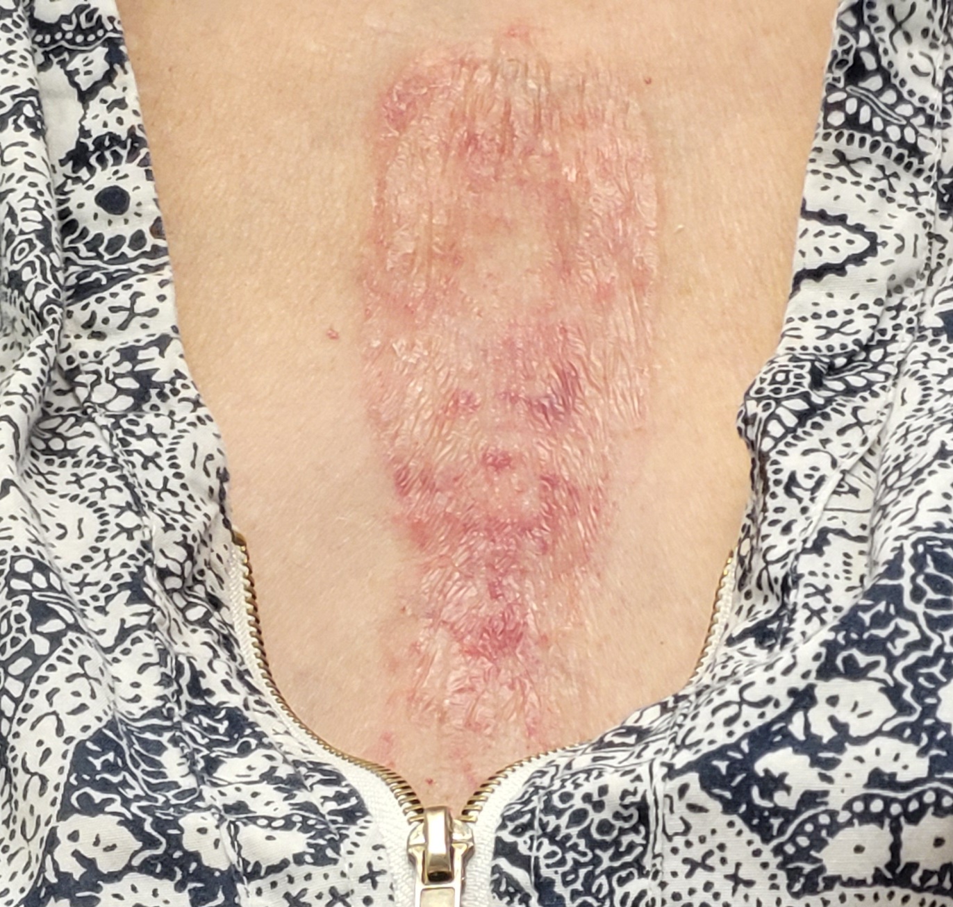 From about hour 12 of wearing the monitor using a single attachment point (called a strip), I began noticing it was irritating my skin. I thought I could deal with it, and tried to ignore it. I honestly don’t know for certain if there’s latex in that strip used to attach the monitor to the chest. All I know for certain is that I when I removed that first strip after seven days, my skin between my breasts was showing that type of irritation, though mild at that point. I still thought I could handle it, and attached a second strip for the next week.