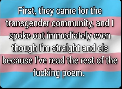The meme has been floating around for a while in the trans and ally community. I honestly didn’t expect this kind of response at all. It’s a take on the “First They Came” poem by Pastor Martin Niemöller. It’s fairly well known by anyone who even slightly studied the history of the Jewish Holocaust. Pastor Niemöller is a complicated figure. He was first an antisemitic Nazi supporter. Later, he was sent to a concentration camp himself.